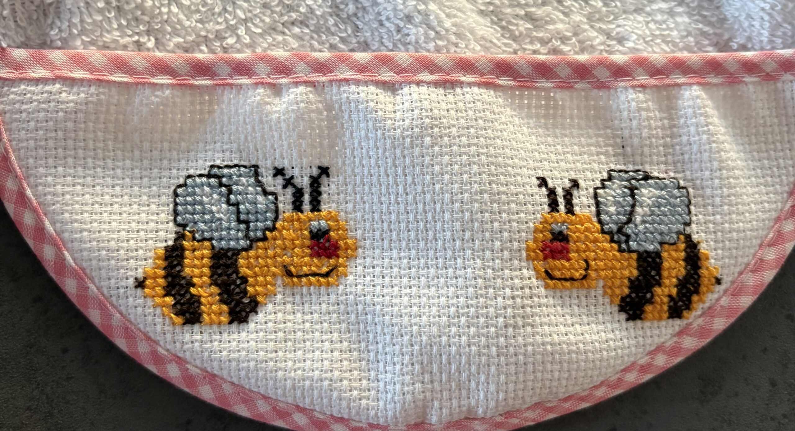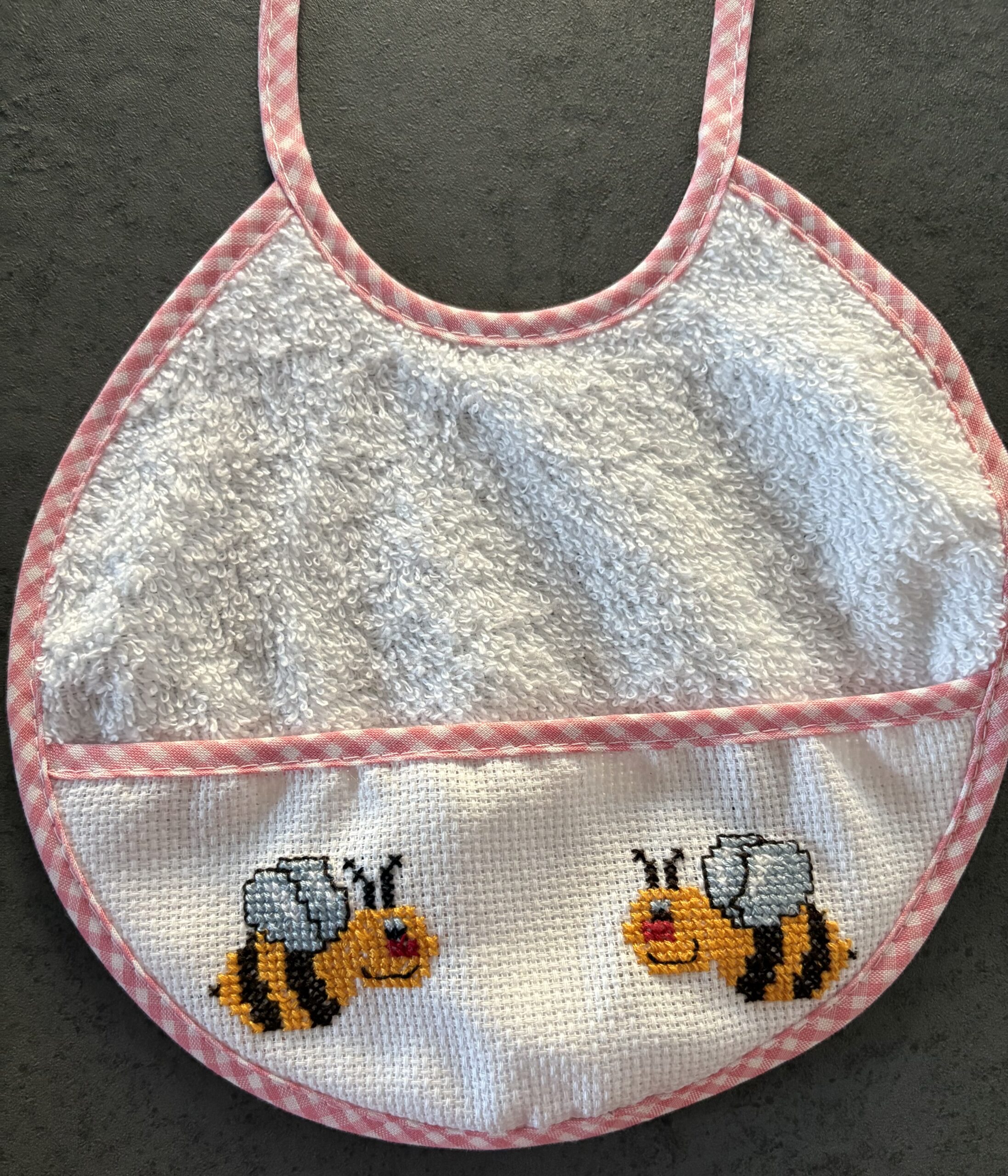 Un tenerissimo bavaglino artigianale in spugna bianca con bordi rosa a quadretti, decorato con due simpatiche apine ricamate a punto croce. Un accessorio unico, realizzato con cura, perfetto per rendere ogni pappa più allegra.