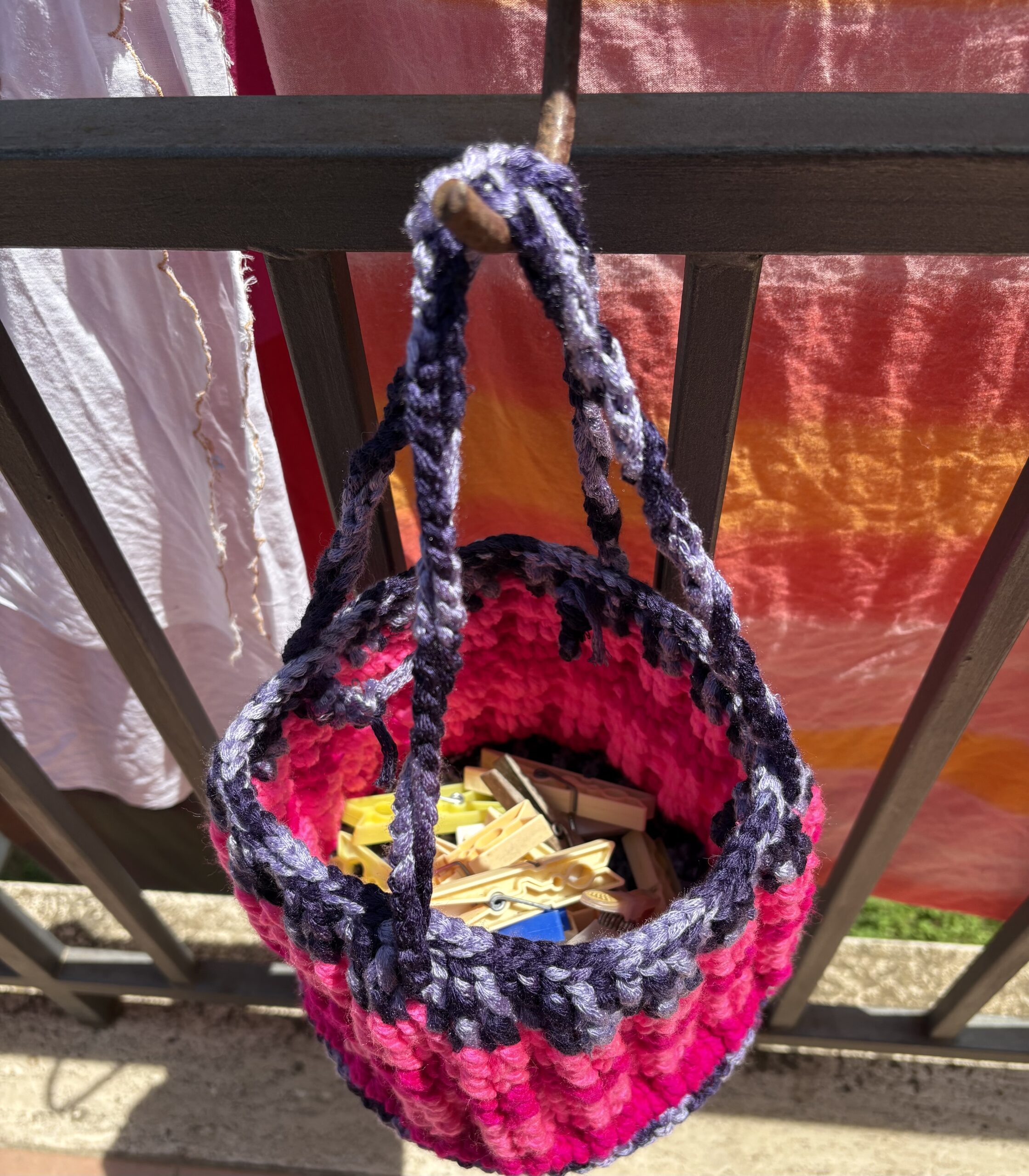 Realizzato con filato acrilico di alta qualità, questo cesto è pronto a resistere a sole, pioggia e vento senza perdere la sua bellezza, a differenza dei classici porta mollette in plastica che si deteriorano facilmente.